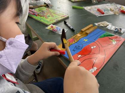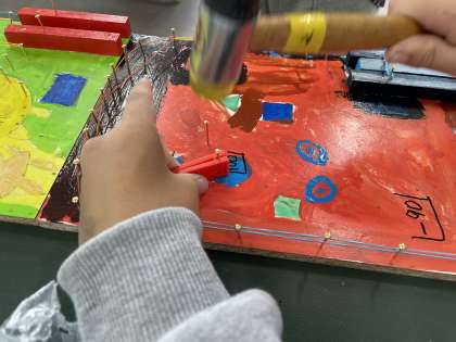 くぎの高さをそろえて打てる「くぎホルダー」というものを使いながら、板にくぎを打ちました。