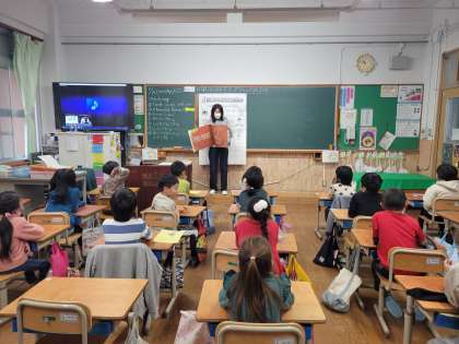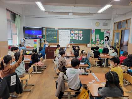 と、ALTの先生が自己紹介で紹介してくれた好きな色の紹介の仕方を聞く子もいました。