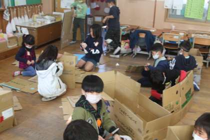 図画工作科の学習で、だんボールカッターを使って自分だけの秘密基地や車などを作り、入って遊びました。