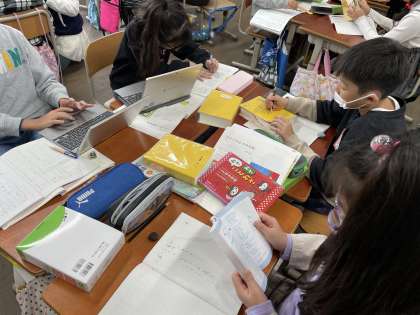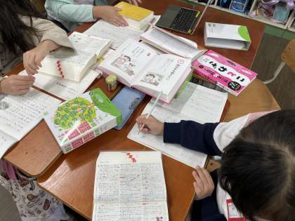 いろいろなことわざの意味を国語辞典やことわざの本、タブレットなどを使ってグループで調べました。また、調べたことわざを使って例文を考えました。