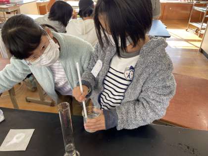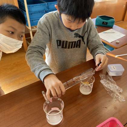 ミョウバンと食塩の溶ける量を増やすにはどのようにすれば良いか、学習問題を立て、予想しました。そして実験計画をたて、いざ実験。「溶けてほしい。」と熱い気持ちも込めながら溶かしたものの、温めても食塩の溶ける量は増えず、予想外の結果に驚く姿がみられました。