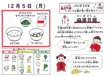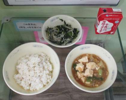 今日の「マーボどうふ」は、1年ぶりの登場でした。久しぶりの登場に子どもたちは大喜び!多く仕上がったにもかかわらず、残菜はほとんどありませんでした。中には、「マーボどうふが一番好き!」という子もいました♪