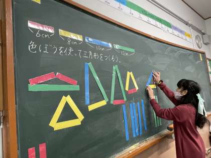 みんなが作った三角形を出し合い、仲間分けをしました。