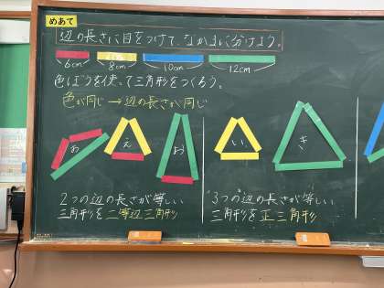 そこで、同じ長さが2つの三角形と3つの三角形、長さがバラバラの三角形に分け、2つの辺の長さが等しい三角形を二等辺三角形、3つの辺の長さがみんな等しい三角形を正三角形ということを学習しました。