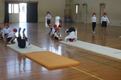 マットで前回り後ろ回りなどいろいろな技に挑戦しています。どうやったらきれいに回れるかなと試行錯誤しながら活動をしています。