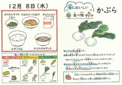 「かぶらのみそ汁」に使用したかぶらは、冬が旬(しゅん)の野菜のひとつです。寒い時期に甘みが増しておいしくなります。子どもたちに、「冬限定のみそ汁だよ!」と伝えると、多くの子どもたちがおかわりをしてくれました♪「『大きなかぶ』に出てくるかぶみたい!」「色はだいこんに似ている!」など、いろいろな発見をしながら味わって食べていました。
