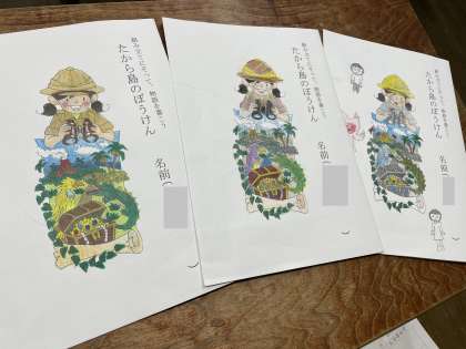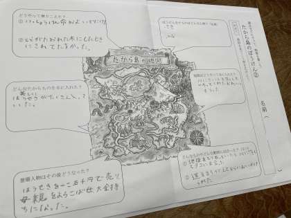 わくわくするぼうけん物語を書くために、地図を見て、冒険する人物、地図の手に入れ方、宝物までの道のりやどのような動物に出会ったのかなどをを想像しました。