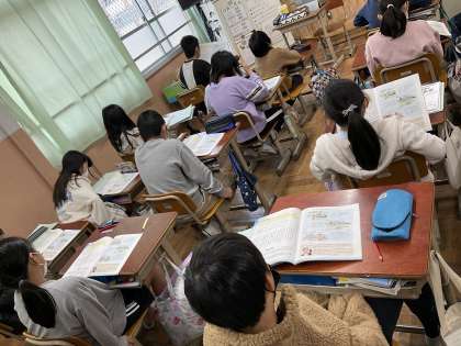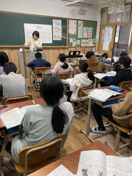 歌詞は有節的な反復の中に 情景や心情の変化があり、子どもたちは曲と共に歌詞のイメージを湧かせながら聞いていました。
