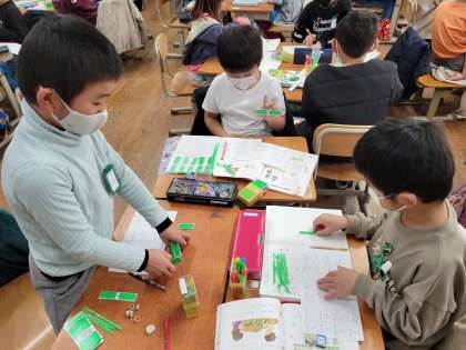 かぞえ棒を並べて「全部でいくつになるでしょう」と問題を出し合いました。