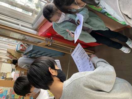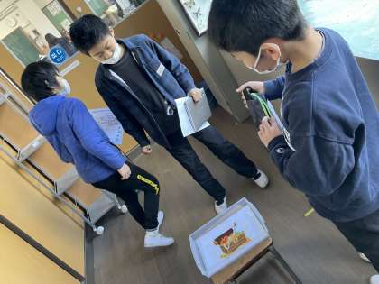In Under On Byに慣れ親しんだあと、校内に隠された宝探しをしました!英文が書かれたヒントカードを読み、どこかに隠された宝を探しに行きました。
