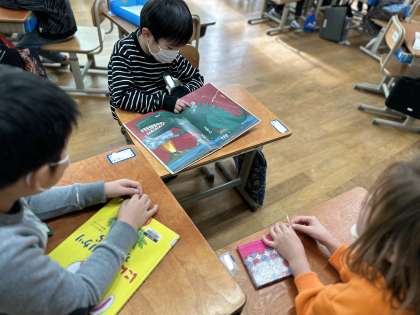 図書館で週に1回本を選んで読んでいます。友だちは、どんなおはなしがすきなのでしょうか。今日は、自分の選んだ本をグループの友だちに紹介しました。身を乗り出しながら質問して、本の世界の面白さを味わっていました。