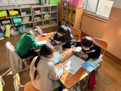 算数科「大きいかず」では、おはじきゲームの点数を使って数を比べました。