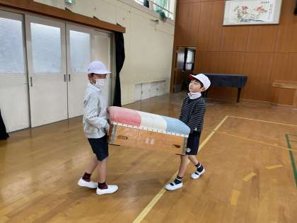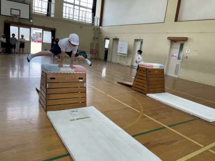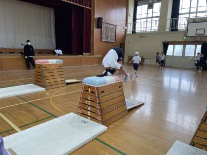 怪我がないよう、体ならしでいろいろな運動をし、今できる技で高さの違うとび箱に挑戦しました。最後は、みんなで協力して後片付けを行いました。