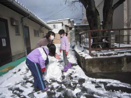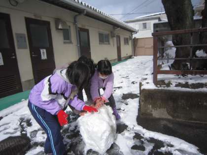 今年はじめての銀世界の朝、中庭で雪遊びをしました。高学年が中心となって大きな雪だるまをつくりました。