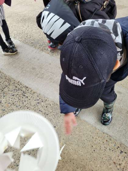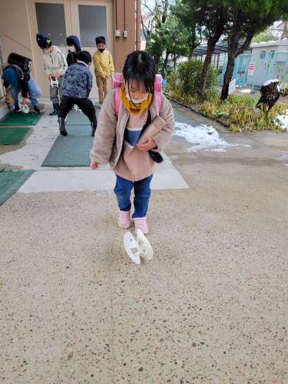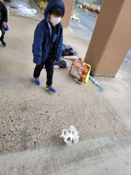 降雪もあり、運動場で遊ぶことはできませんでしたが学級で「さようなら」をした後に他のクラスの友だちを待ちながらピロティで、おもちゃを走らせて遊びました。