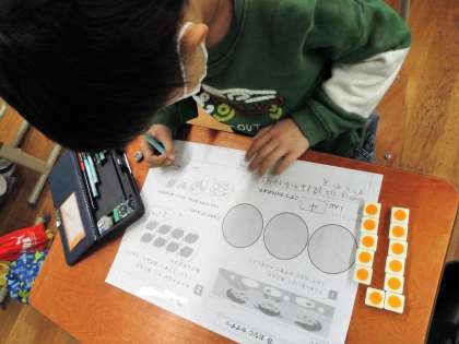 どうすれば,速く等しく分けられるか,数図ブロックをつかって、わけかたを考えました。同じ数ずつ分けたり、まとめて数えて分けたりしました。