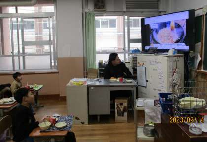そこで、給食調理員さんの1日のお仕事に密着した「給食室の1日」という動画を各クラスで視聴しました。約10分間の動画の中で、子どもたちは、