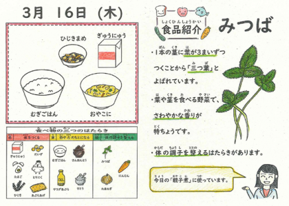 今年度の給食も、残すところあと3回となりました。最後まで味わって食べてもらえると嬉しいです。明日の給食は「さわらのたつたあげ」です。お楽しみに!