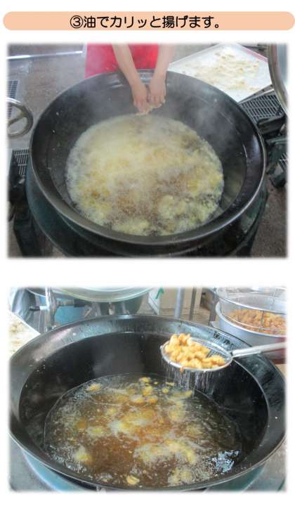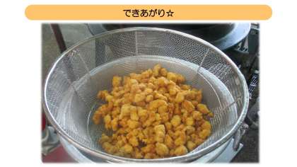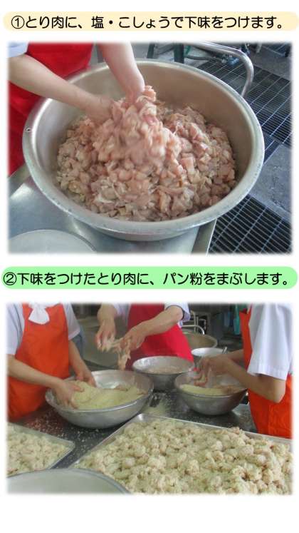 下味をつける・衣をつけてパン粉をつける・油で揚げる作業は、すべて手作業で行いました。給食調理員さんたちが、ひとつひとつ愛情をこめながら作ってくださいました♪