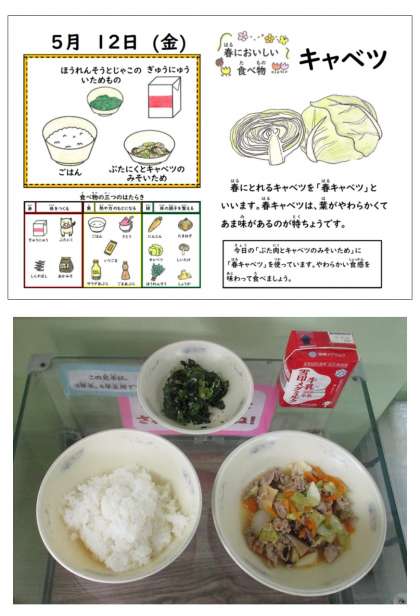 <豚肉とキャベツのみそいため>には、春にとれる<春キャベツ>を使用しました。春キャベツは、葉がやわらかくて、あま味があるのが特徴です。