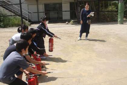 今日は火災の時の避難訓練をしました。3年生は消火訓練の体験をしました。