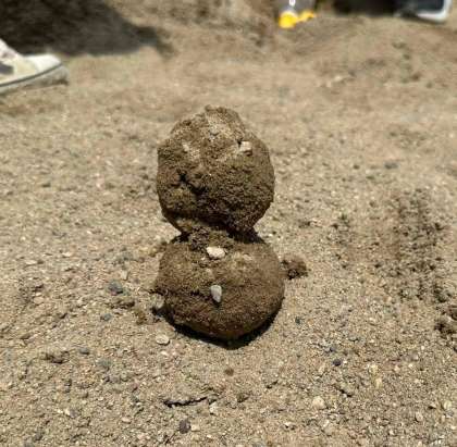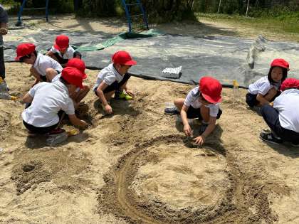 砂や土にふれながら、作りたい形を作りました。山を作ったり、容器に土を入れ、形をつくって並べたりするなど、楽しんで造形遊びをすることができました。