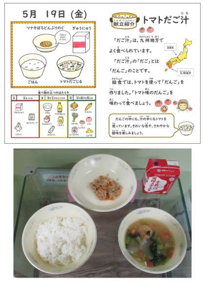 だご汁は、九州地方でよく食べられています。「だご汁」の「だご」とは「だんご」のことです。給食では、トマトを使ってだんごを作りました。ひとつひとつ、給食調理員さんの手作りです!もちもちとした食感で、おいしかったですね♪