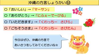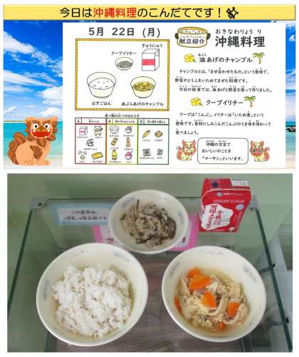 沖縄料理献立ということで、給食時間には食事にかかわる沖縄の方言について紹介しました。さっそく、「今日の給食、マーサン(おいしい)やった!」と伝えてくれる子や、給食室で「くわっちーさびたん(ごちそうさまでした。)」とあいさつをしている子が多くいました。