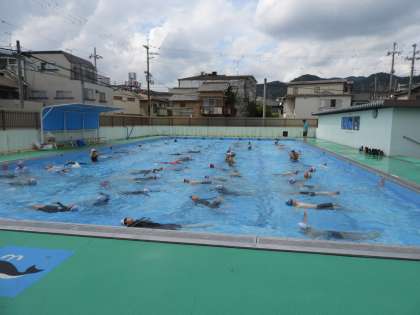 曇り空に晴れ間が見えて、気持ちの良い水泳学習ができています。さすが6年生、浮き方も上手です。