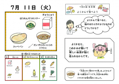 明日の給食は、「豚肉とゴーヤのしょうがいため」です。夏が旬のゴーヤが登場しますよ。お楽しみに!