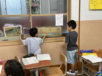 算数科で「おおきさくらべ」の学習をしています。紙テープをつかうと、長さくらべをすることができることが分かりました。また、水のかさは水をうつしたり、同じ入れ物にいれたりすることで比べられることを学習しました。