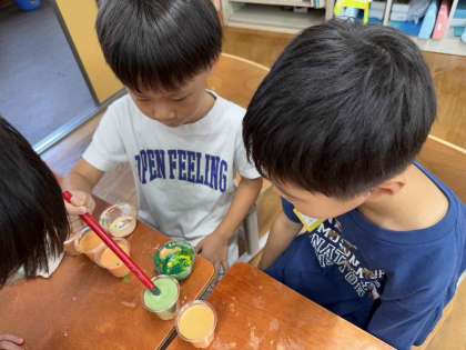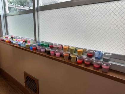 図画工作科で「カラフルいろみず」の学習をしました。絵の具をまぜて、どんな色ができるのか楽しみながら活動することができました。ジュース屋さんみたいに、色のついたコップを並べて、色がかわることを楽しむことができました。