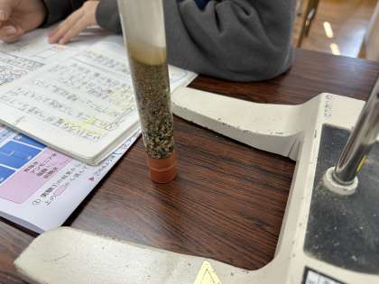 今日は筒の中に砂を流してどのように堆積していくのかを実験していました。