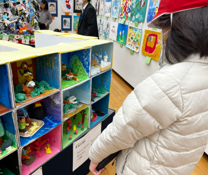 小さな巨匠展の見学に行きました。自分たちの作品も展示されており、うれしそうな表情を見せていました。ほかの学校のお友だちの作品も鑑賞しました。お気に入りの作品を見つけ、帰ってきてからみんなに紹介しました。