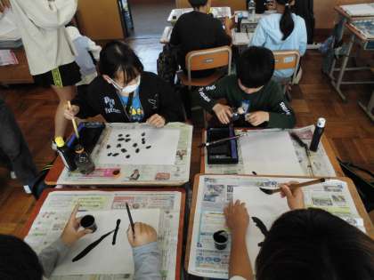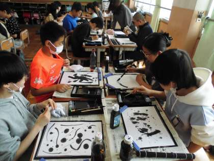 墨の濃さや、筆使いを工夫したり、ストローなどの道具を使ったりして墨の良さを味わいました。