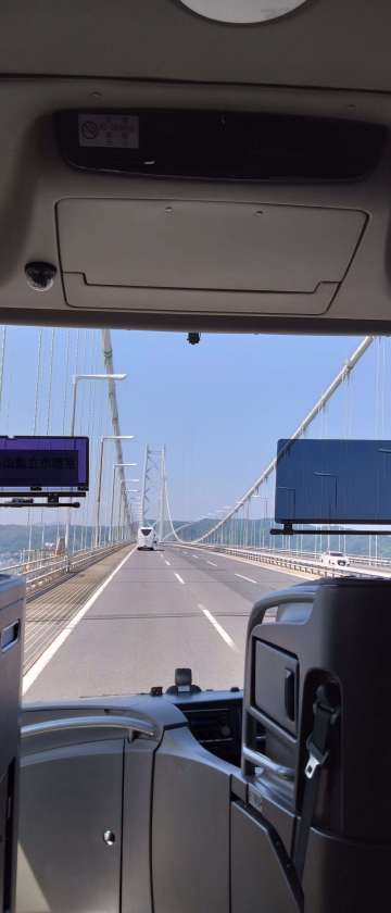 橋に海、貨物船と皆喜んでいます。いよいよ淡路島に入ります。