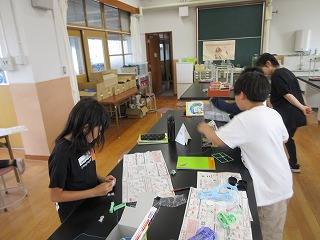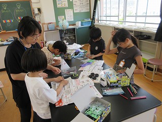 電流の向きとモーター(プロペラ)のまわり方の関係を調べるための実験道具を製作しています。製作した道具で、次の時間に実験をしましょう!