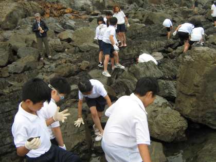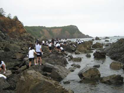 「初めて生きたカニをさわりました。」潮だまりには小さな海の生き物たちが生活していました。子供たちは夢中になって磯観察を続けていました。みさきの家にもどり,少し早目の入浴を行います。