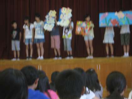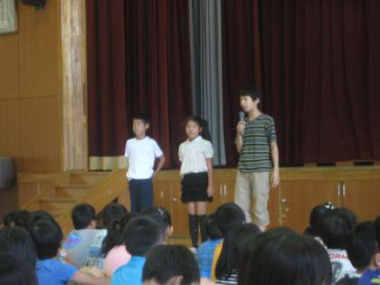 9月2日(火)今年度活発に行われている委員会活動の紹介をする児童集会が行われました。今回は,栽培委員会と掲示委員会です。栽培委員会は,校内に植えている植物の紹介と日頃の水やりと雑草抜きなどの活動を紹介しました。掲示委員会は,給食室横の掲示板に季節に合わせた掲示物を貼り,工夫していることを紹介し,これから,行事の紹介もすることを伝えました。児童集会は,5・6年生が司会を務め,全校児童も静かに聞き入りスムーズに進めることができました。
