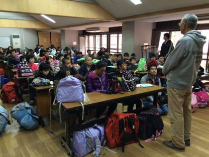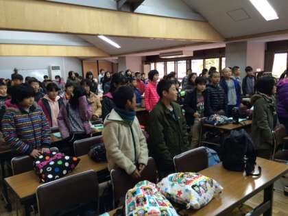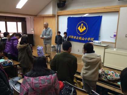 山の家の所員の方からお話を伺った後、校歌を元気よく歌いました。