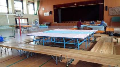 卓球台や長椅子などを並べ,工夫して展示しました。