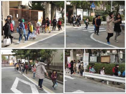 集団下校では,通学路の確認や危険箇所がないかどうかの確認をして,並んで帰ります。