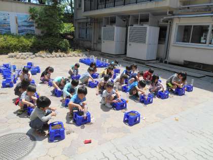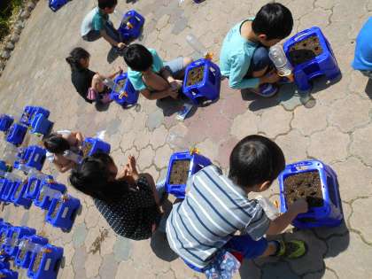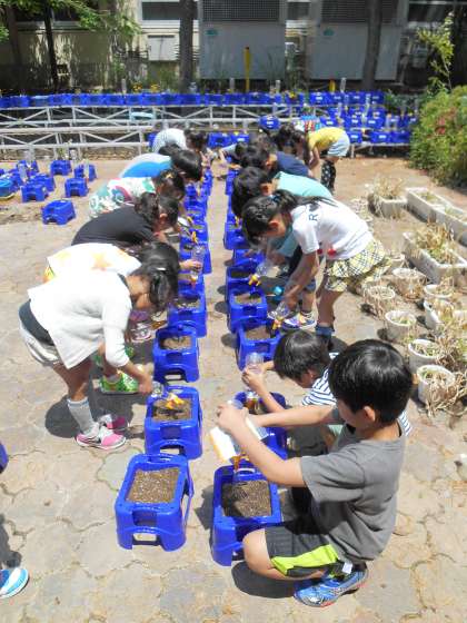 生活の単元「おおきくなあれ わたしの はな」の学習として,先日観察したあさがおの種を植えました。プランターに土を入れ,指で穴をあけ,種にやさしく土をかけました。その後に,ペットボトルのじょうろで水やりをしました。