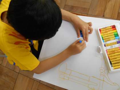 図工の時間に,コンテとパスを使って,お花に水をあげている絵を描いています。先日の学校探検で見た花壇のお花に水やりをする自分をイメージしながら取り組みました。先日,ステンシルの技法を用いながら,思い思いに花を描き,今回パスで色をつけて完成しました。