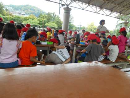 待ちに待ったお弁当の時間には,自慢のお弁当を見せ合いっこしながら,嬉しそうにほおばっていました。お弁当タイムの後,最後の散策をしました。暑さに負けず,一生懸命歩きました。
