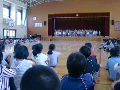 学校生活にも慣れ,楽しそうに中庭で遊ぶ姿がとてもかわいいです。6年生も手を振ったり,声をかけたりして1年生と交流しています。今日はその気持ちが1年生に伝わるように心を込めて「Let's sing a song」を歌いました。