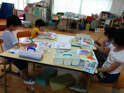 2年生は初めて絵の具を使いました。筆の使い方や水の量や絵の具の出し方など学習しました。アジサイの花びらを赤と青と黄の色を使って塗りました。濃さを工夫しながら丁寧に塗ることができました。