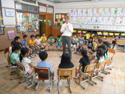 ALTのベン先生と一緒に,英語の学習をしました。いろいろな色を英語で発音したり,フルーツバスケットの要領でゲームをしたりして楽しく活動しました。