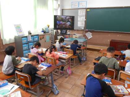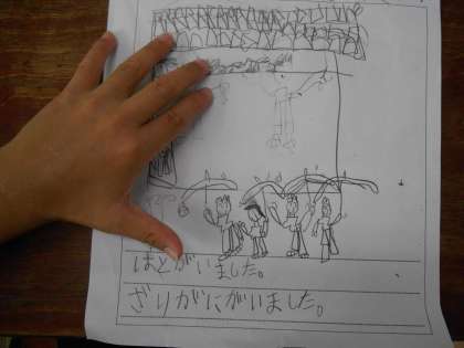 学校に帰ってから,見つけたものをワークシートにかきました。雨だったこともあり,じっくり観察できなかった子もいたので,散策中に撮影した写真も参考にしながら進めました。