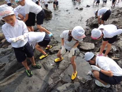 ヤドカリやカニ,魚を見つけた子どもたちもいます。